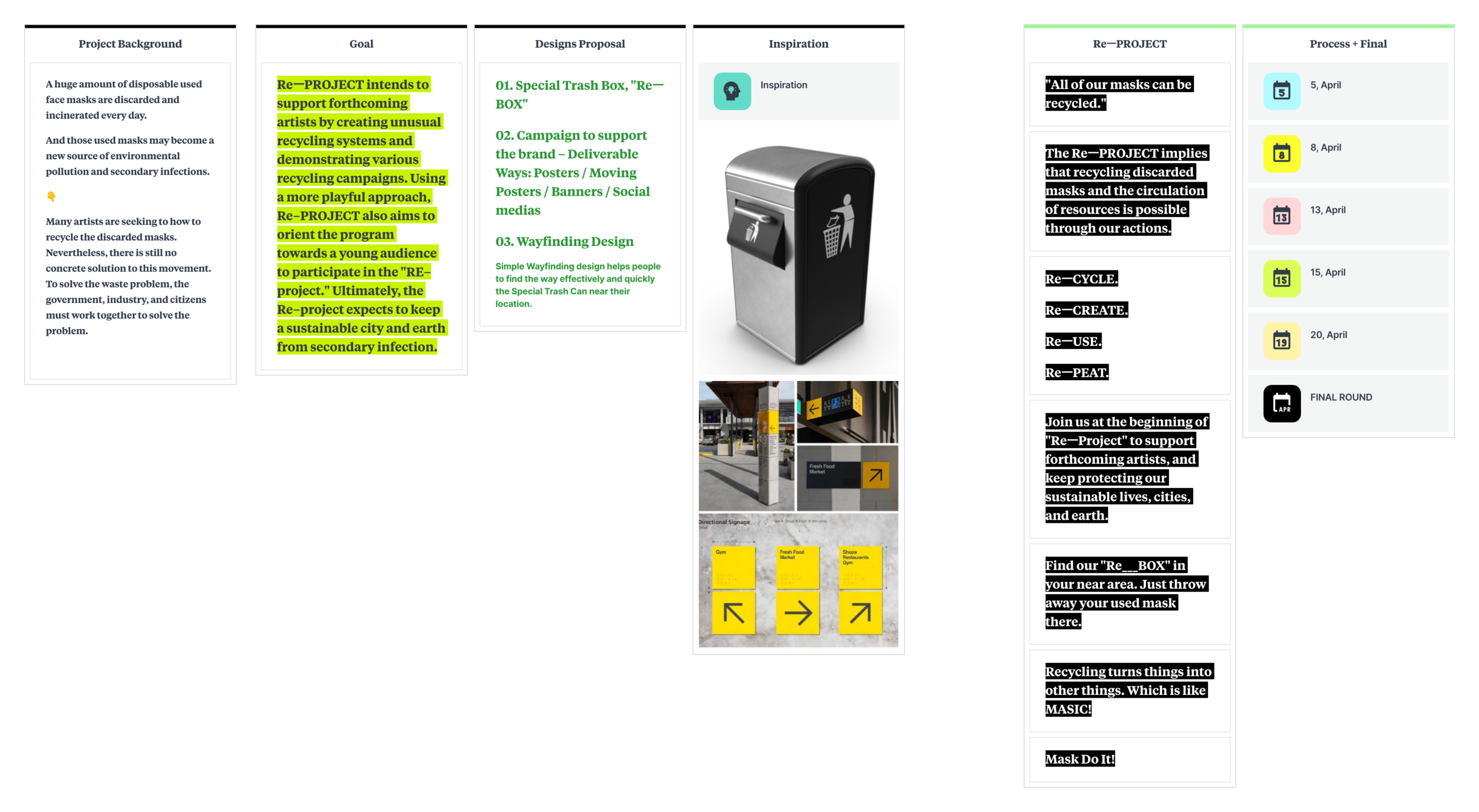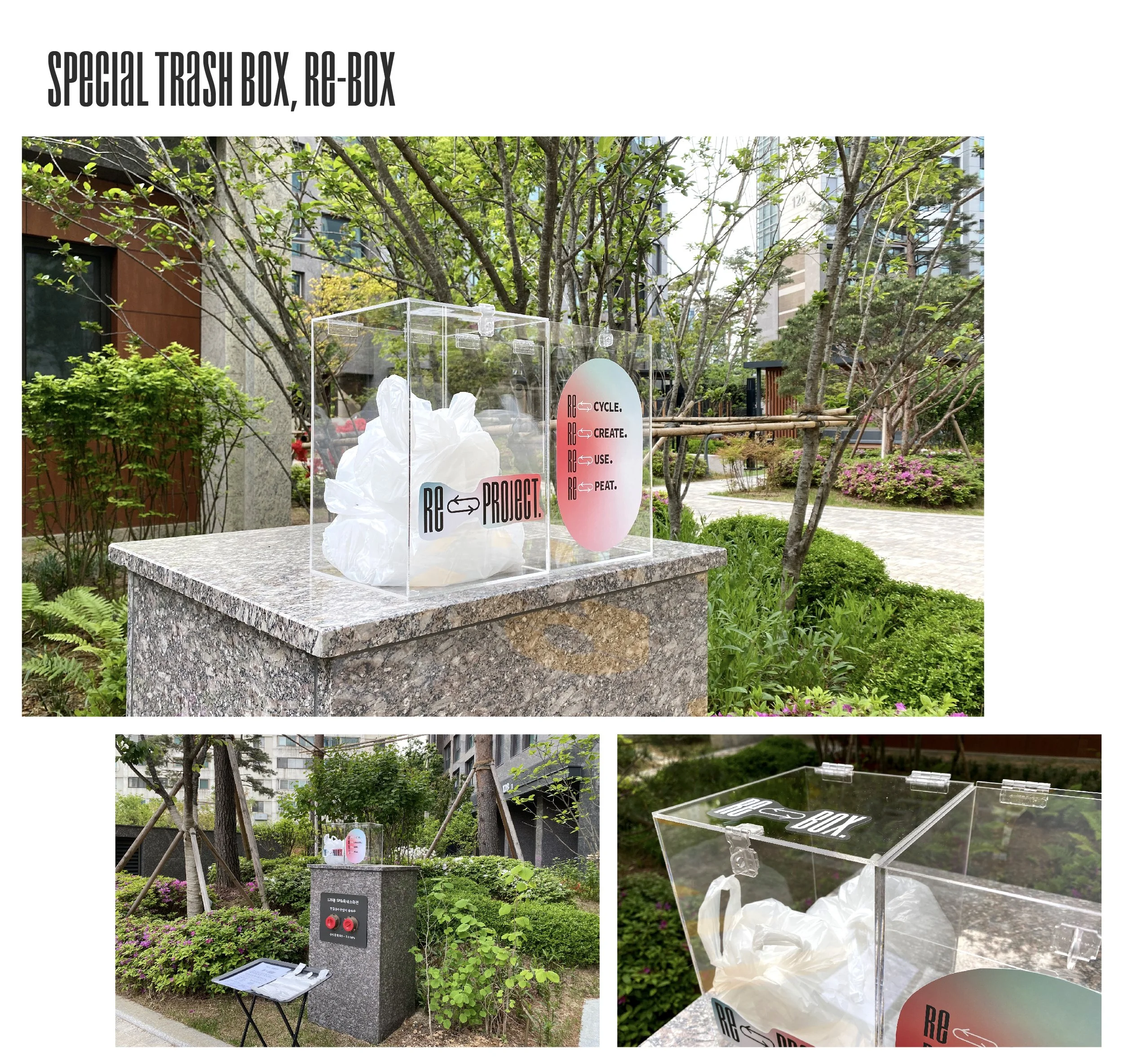 This project intends to support forthcoming artists by creating unusual recycling methods and demonstrating various recycling campaigns. Using a more playful approach, RE–Project aims to orient the program towards a young audience to participate in the "RE–Project." Ultimately, the project expects to keep a sustainable city and earth from secondary infection.
