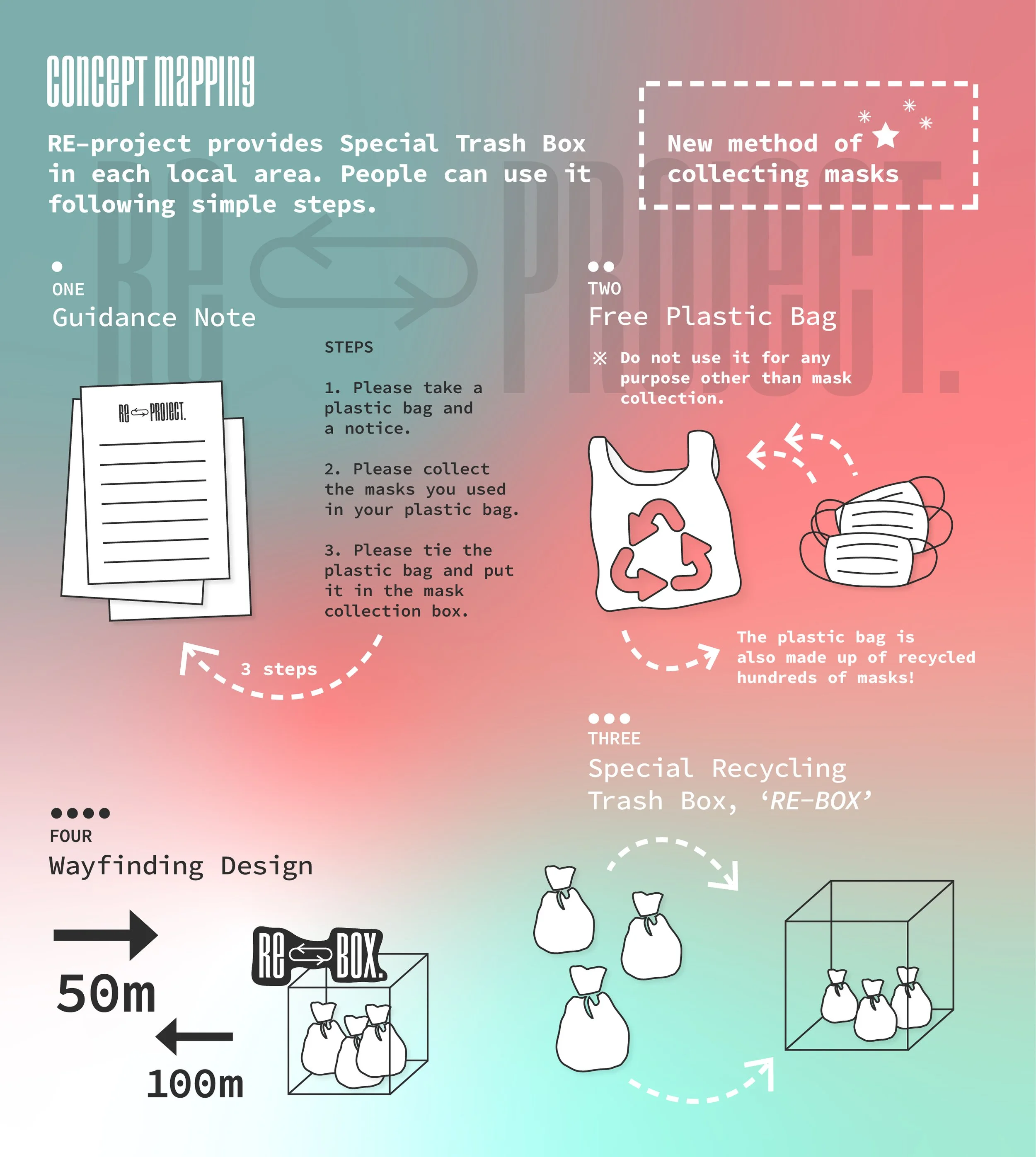 💡 Special Trash Box, RE–Box: Find 'RE–Box' in your near local area. Just throw away your used mask there, following a few simple steps.